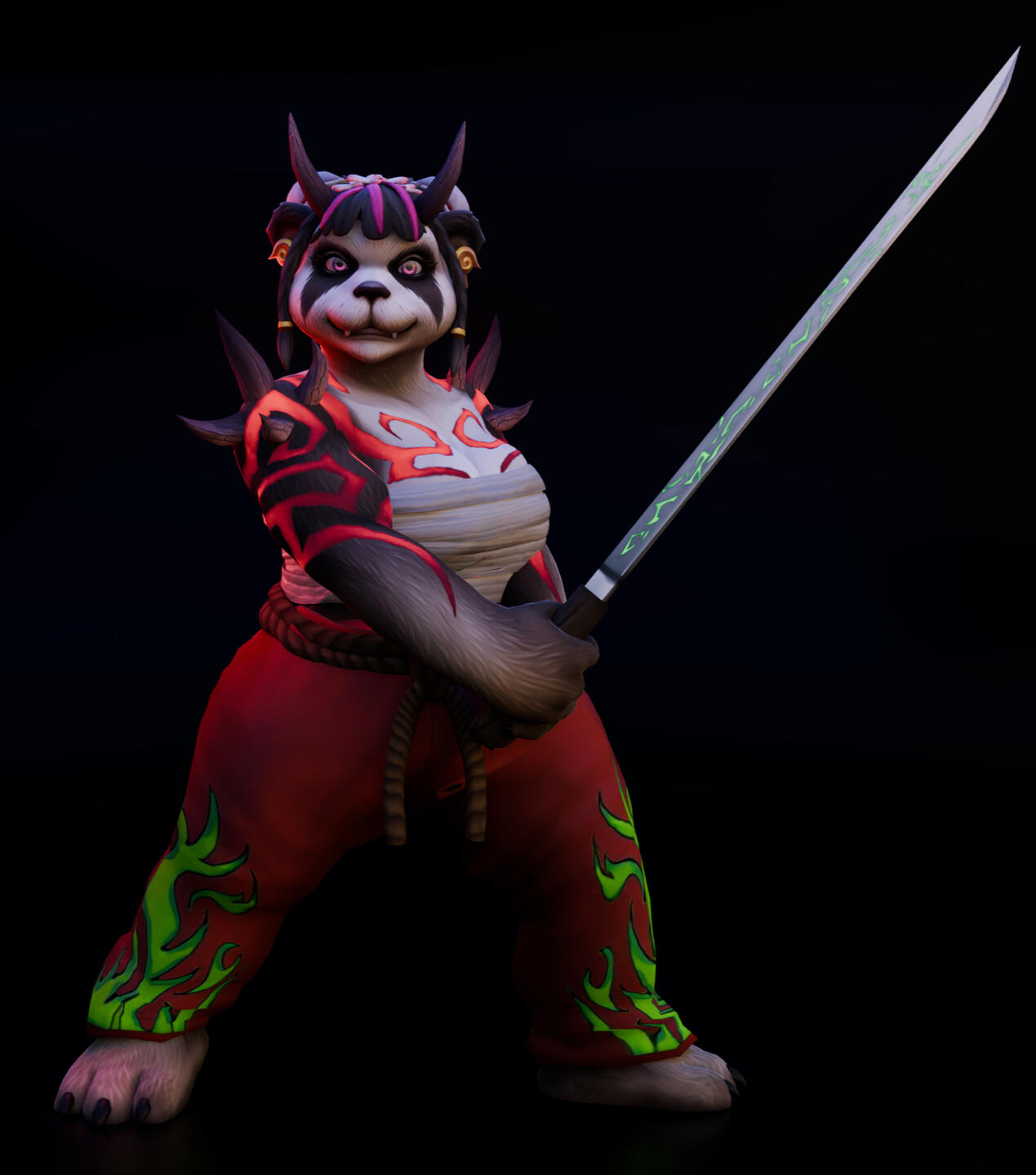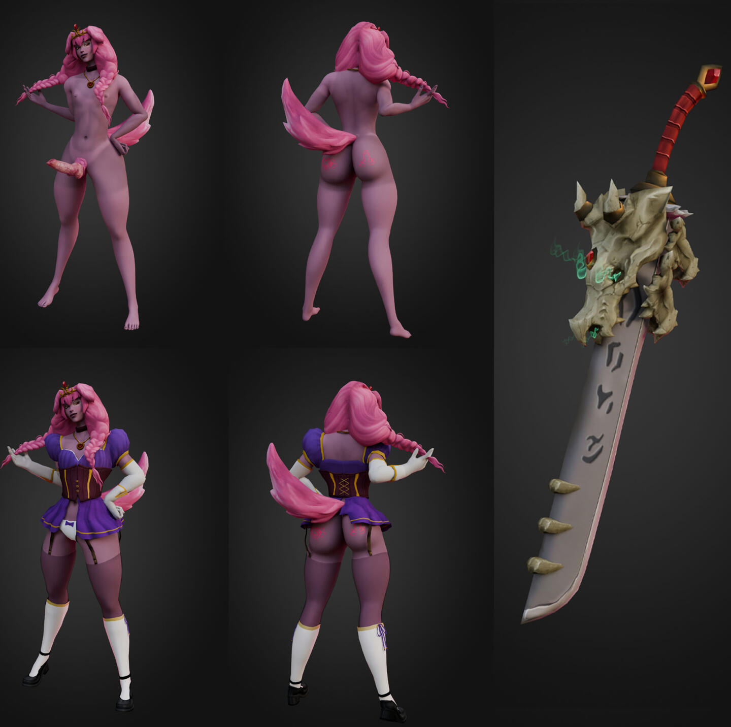 You'll recibe a Blender file with everything in it. The base price includes texture enhancements and model rigging. Nothing custom. The price of any custom items, including armor, clothing, and/or weapons, varies depending on their complexity. A full NSFW model with armor and weapons costs around 130 €. Don't be shy and ask any questions you want!